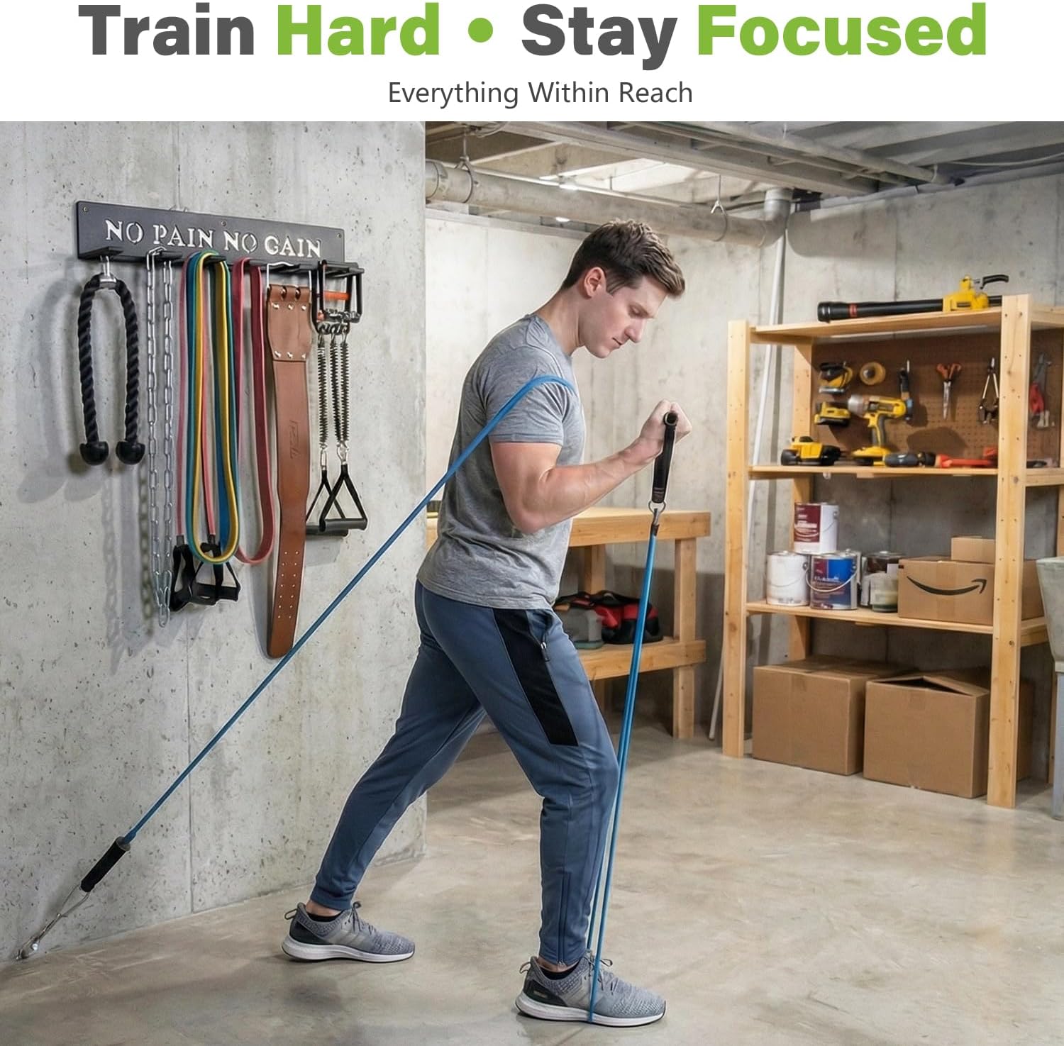 Sports, gear like barbells, lifting belts, chains, jump ropes, resistance bands, and gym bags. It goes well beyond traditional door-mounted hooks as they are more stable and durable while providing far more options for workouts.